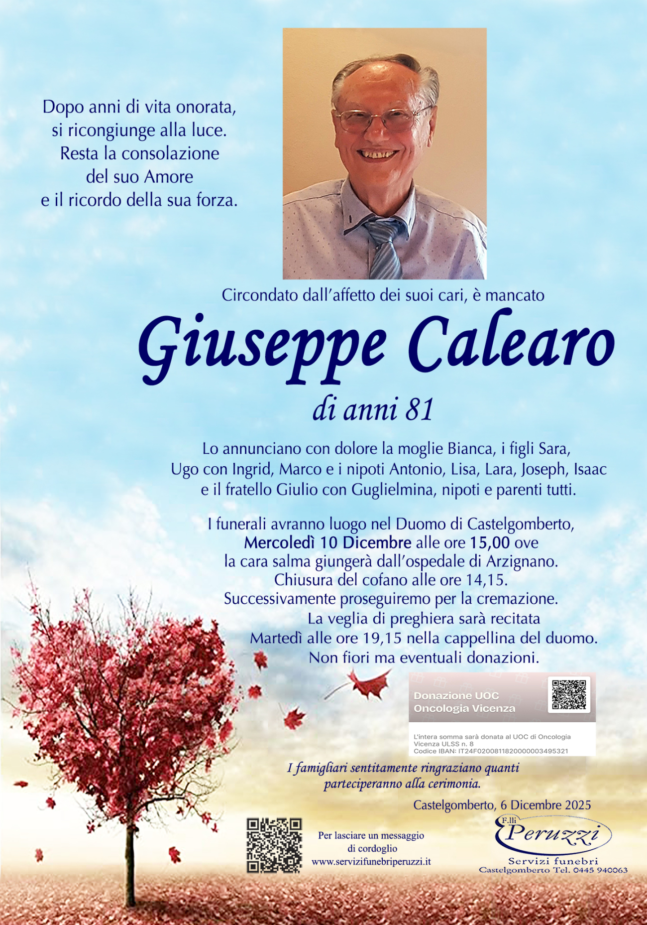 Funerale: Lunedì 9 Dicembre ore 15:00 Duomo di Castelgomberto