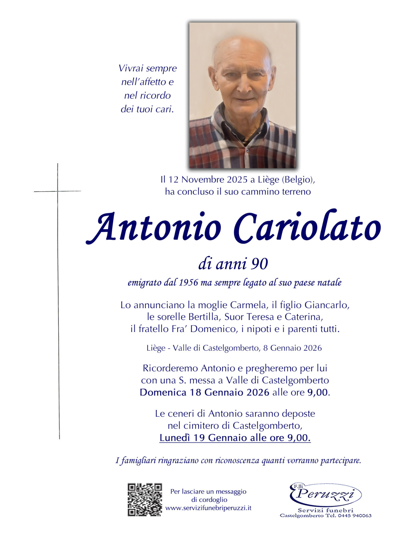 Funerale: Mercoledì 14 Gennaio ore 15,00 Duomo Castelgomberto
