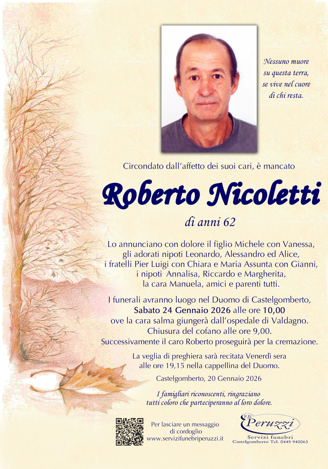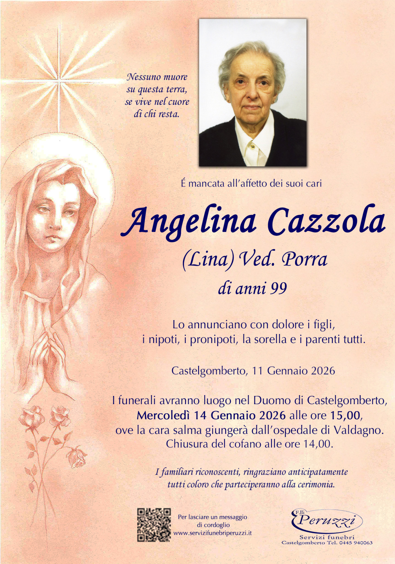 Funerale: Sabato 24 Gennaio ore 10.00 Duomo Castelgomberto